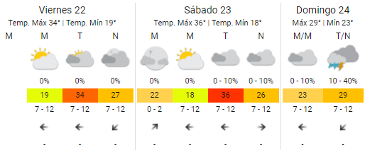 Para el sábado anticipan una máxima de 36°C con un cielo parcialmente nublado. Mientras que el domingo podría tornarse inestable luego de una jornada con temperaturas que no superarán los 29°C.