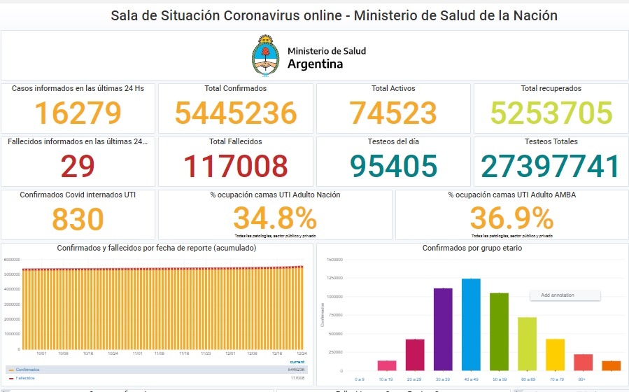 El reporte del Ministerio de Salud confirmó 16.279 nuevos contagios en las últimas 24 horas, la cifra más alta desde julio. Con estos registros, suman 5.445.236 casos desde que comenzó la pandemia. Además, se registraron 29 nuevas muertes de pacientes con coronavirus lo que eleva la cifra de víctimas mortales en el país a 117.008.