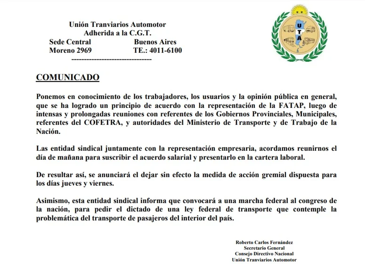“ Se ha logrado un principio de acuerdo con la representación de la FATAP, luego de intensas y prolongadas reuniones con referentes de los Gobiernos Provinciales, Municipales, referentes del COFETRA, y autoridades del Ministerio de Transporte y de Trabajo de la Nación ”, explicó el secretario general de la UTA, Roberto Fernández. Y, enseguida agregó: “La entidad sindical juntamente con la representación empresaria, acordamos reunirnos el día de mañana para suscribir el acuerdo salarial y presentarlo en la cartera laboral”.