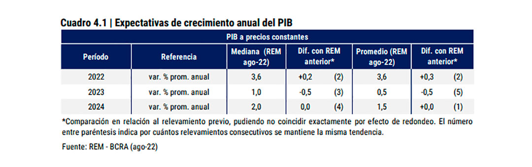 En relación con la actividad económica, hubo leve optimismo para este año y pesimismo para 2023. Los consultores recopilados por el BCRA estimaron que el PBI crecerá un 3,6% en 2022, con lo que subieron 0.2 p.p. su medición del mes anterior. También estimaron que durante el segundo trimestre de 2022 “el PIB habría aumentado 0,7% sin estacionalidad, implicando una corrección al alza del pronóstico de variación del nivel de actividad de 0,2 p.p. con respecto a la encuesta previa. En tanto, se espera que durante el tercer trimestre de 2022 haya una contracción de 1,4% del nivel de actividad”, sin cambios en relación al REM anterior. El pronóstico para el cuarto trimestre de 2022 arrojó una caída del 1% sin estacionalidad (un mes atrás se esperaba una contracción de 0,7% s.e.)