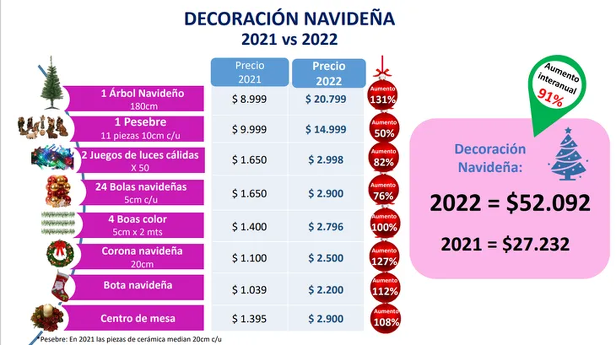 «Los artículos de decoración navideña tuvieron aumentos de tres dígitos por que hay una importante cantidad de los mismos que se importan de china. Los precios en dólares de estos artículos han subido, la logística internacional se encareció y la oferta disminuyó. A su vez, para el caso de las figuras del pesebre que sólo aumentaron 50 % interanual han implementado una reducción del tamaño de las figuras pasando de una altura de 20 cm a 10 cm. Es algunas de las estrategias que plantea el mercado para no ver un deterioro en el volumen de ventas para la decoración tradicional de esta festividad», concluyó.