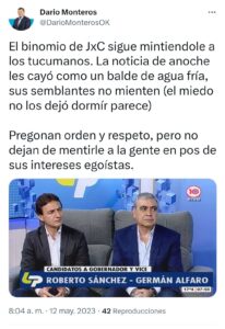 «El binomio de JxC sigue mintiendole a los tucumanos. La noticia de anoche les cayó como un balde de agua fría, sus semblantes no mienten (el miedo no los dejó dormír parece). Pregonan orden y respeto, pero no dejan de mentirle a la gente en pos de sus intereses egoístas», expresó el intendente Dario Monteros en sus redes sociales apuntando contra la formula Sanchez – Alfaro.