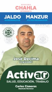 Decima acompaña la Lista Activar, la cual tiene también como candidato a legislador a Hugo Ledesma, Sebastián Giobellina candidato a concejal y es conducida por Carlos Cisneros, «Este espacio trabaja continuamente para que Rossana Chahla sea nuestra intendente, la gestión de Alfaro deja mucho que desear, nosotros junto con el apoyo de Osvaldo Jaldo y Miguel Acevedo vamos a sacar adelante a nuestro municipio», señaló.