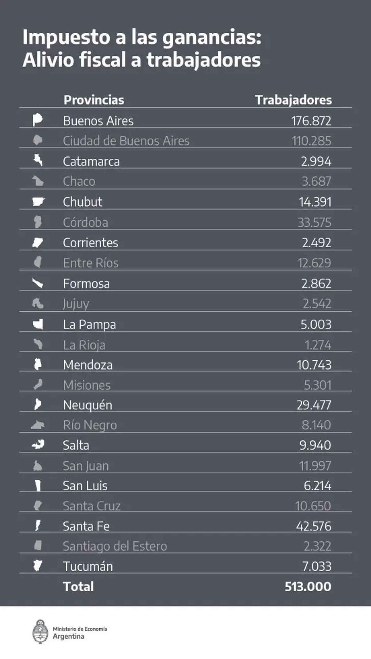 La medida beneficia a 513 mil trabajadores y trabajadoras de todo el país que se encuentran sujetos a retenciones del impuesto a las Ganancias y registran salarios brutos mensuales de entre $506.230 y $880.000. En este sentido, más del 50% de los trabajadores que hoy pagan el impuesto a las Ganancias están alcanzados por el beneficio.