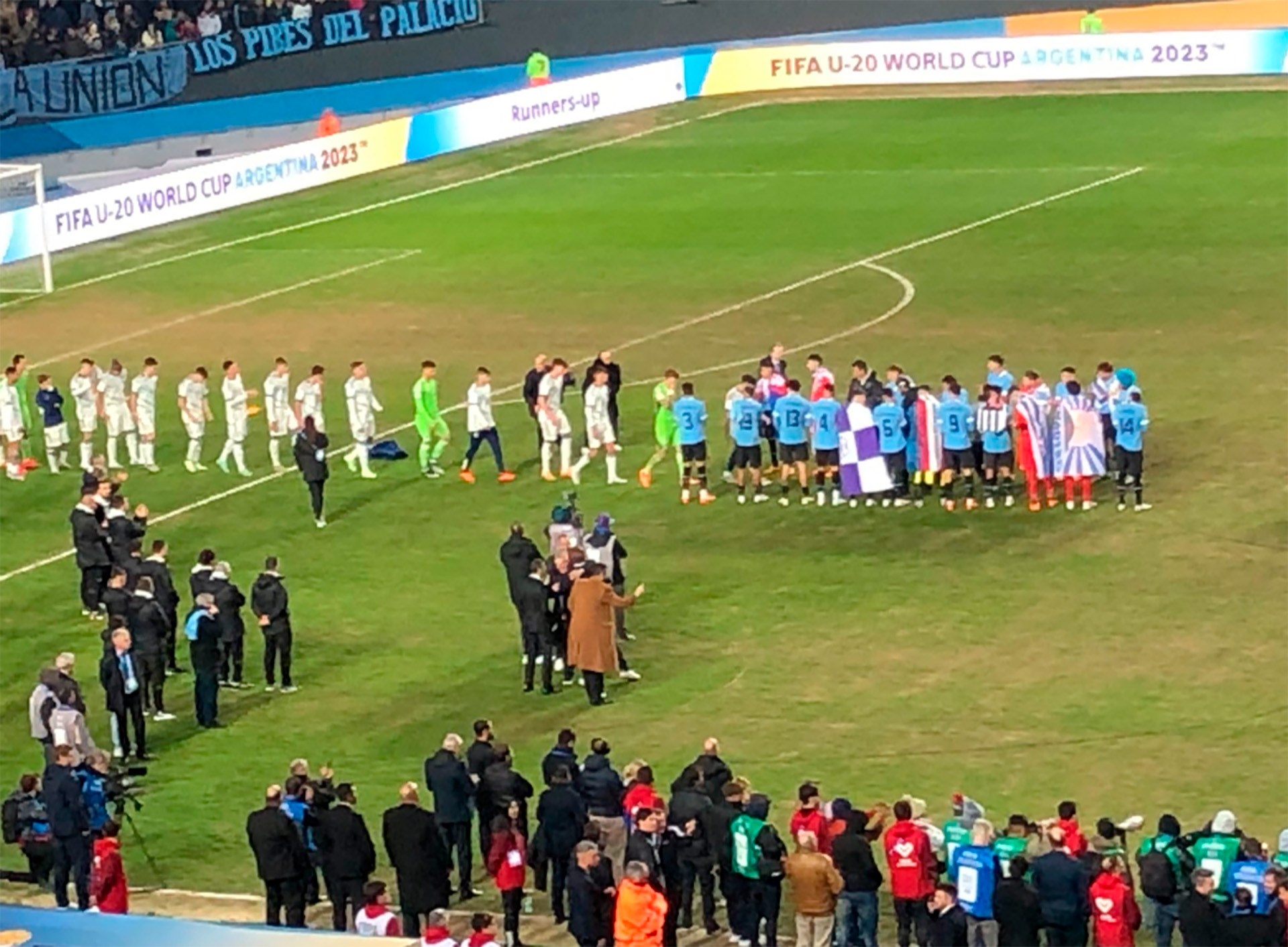Al ritmo de “es un sentimiento, no puedo parar”, los fanáticos que coparon el reducto empezaron a sentir que la meta ansiada estaba a un paso de su realización máxima, pero no fue hasta el pitazo final que la olla a presión se destapó para transformarse en un grito unificado y hacer que el “Dale campeón” deje de ser un sueño para transformarse en una realidad. La algarabía se trasladó a la cancha con todos los futbolistas festejando contra uno de los costados del estadio mientras se unían a los cánticos de la afición. Fueron ellos quienes se rompieron las palmas para aplaudir a Alan Matturro segundo mejor jugador del Mundial de la categoría por detrás de la consideración de Cesare Casadei, goleador con 7 tantos.