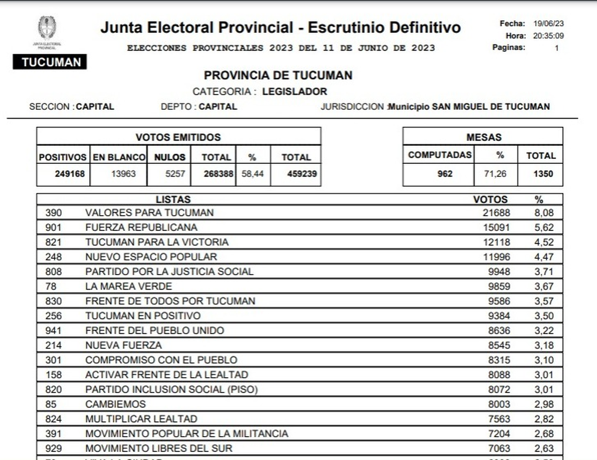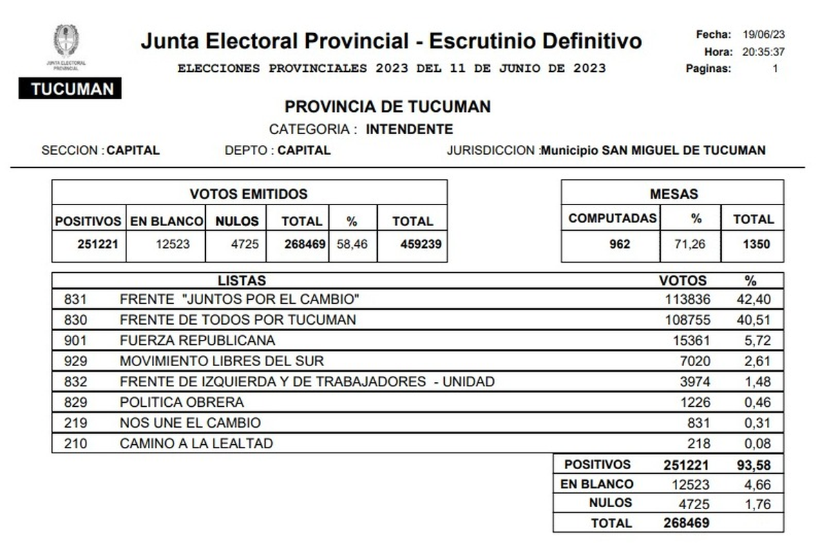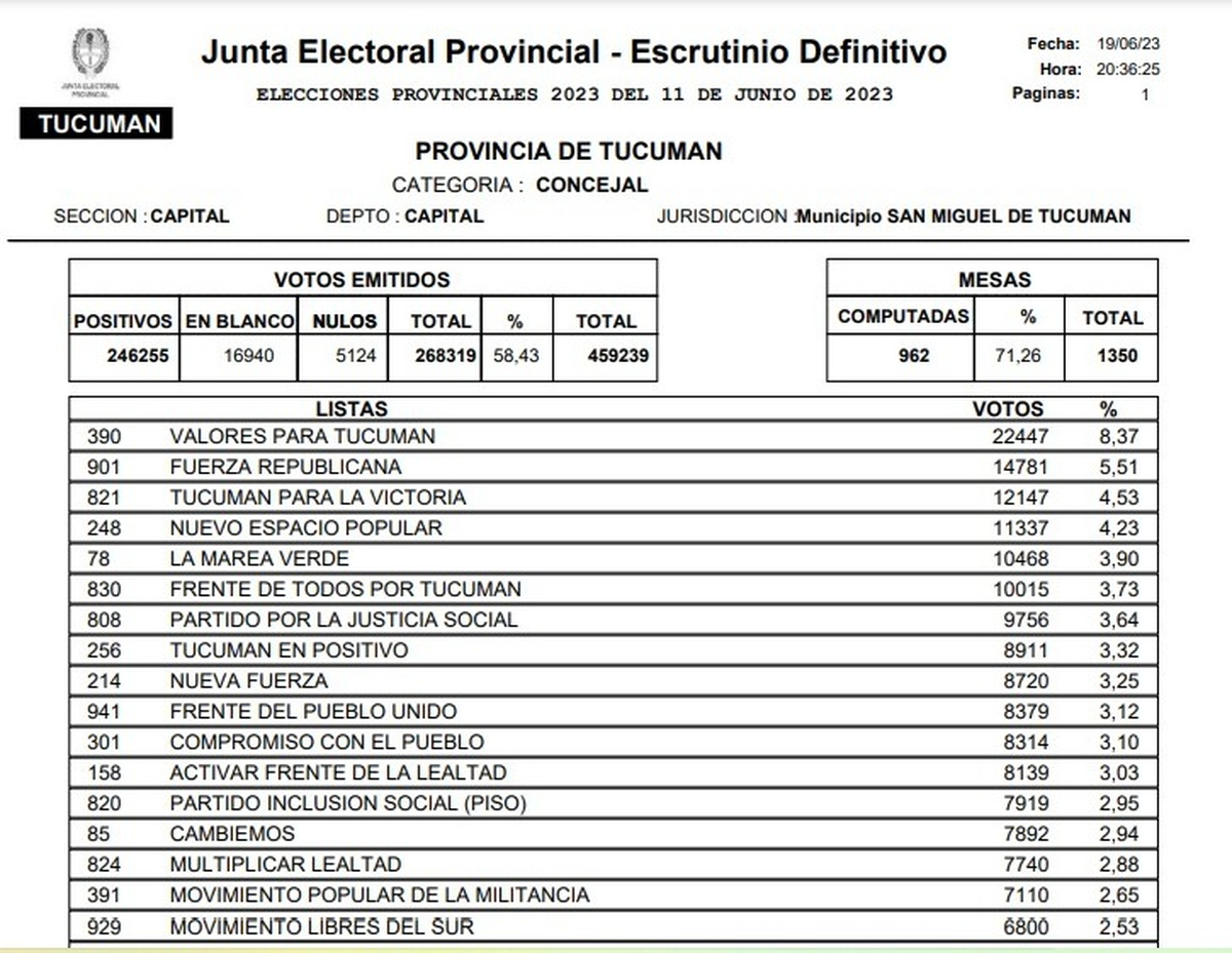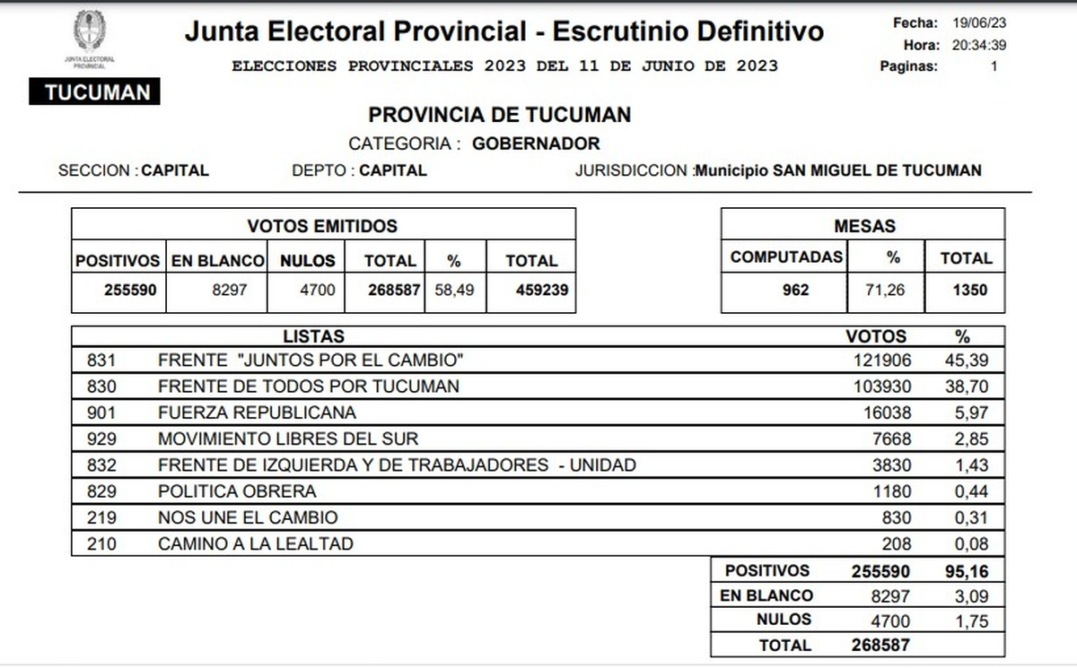 La Junta Electoral Provincial informó que este lunes se finalizó con 962 mesas escrutadas de Capital, tras las elecciones generales del pasado 11 de junio.