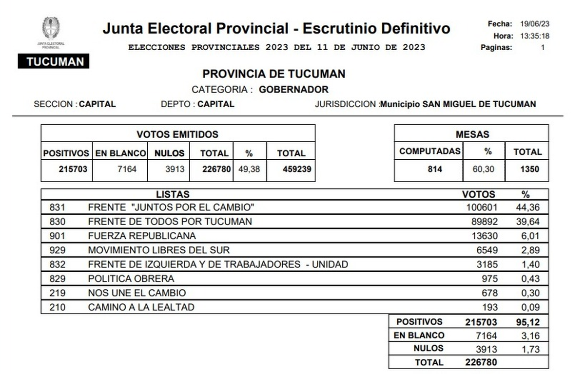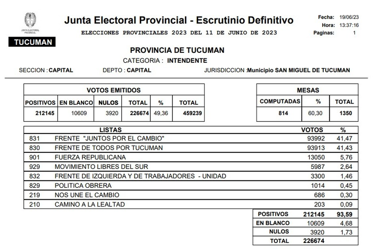 La Junta Electoral Provincial informó que este lunes, llevan 814 mesas escrutadas de Capital, tras las elecciones generales del pasado 11 de junio.