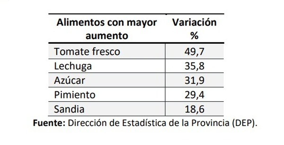 La variación de la CBA y de la CBT, con respecto al mismo mes del año anterior, es de 119,2% y 111,9% respectivamente. Los 5 alimentos que mayor variación presentaron en comparación del mes pasado.