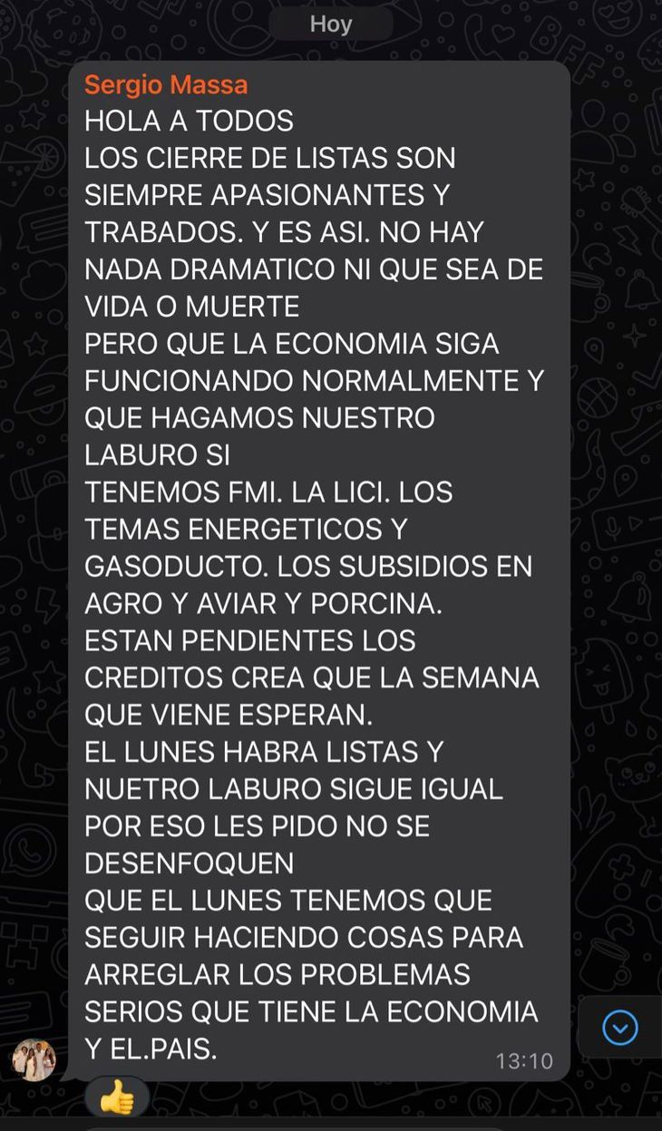 En un mensaje a sus colaboradores, Massa señaló que “los cierres de listas son siempre apasionantes y trabados y es así. No hay nada dramático ni que sea de vida o muerte pero que la economía siga funcionando normalmente y que hagamos nuestro laburo”.