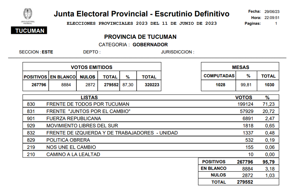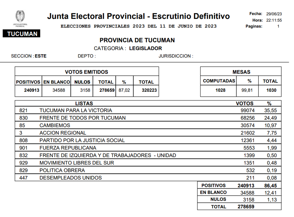 La Junta Electoral Provincial ha anunciado hoy la finalización del escrutinio definitivo de las elecciones provinciales del pasado 11 de junio. El último tramo del escrutinio correspondió a la Sección Este, y con su conclusión se ha completado todo el proceso de conteo de votos.