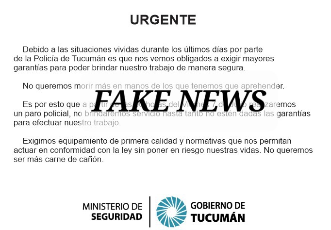 Ante rumores de que la Policía de la Provincia de Tucumán iniciaría un paro a partir de las 00:00 hs por algunos reclamos (entre algunos de ellos la garantía de seguridad al cuerpo policial durante las horas de trabajo), GN NOTICIAS hizo una exhaustiva investigación llegando a la conclusión que la difusión de este comunicado es una noticia falsa, que busca crear malestar en la fuerza policial y tratar de llevar intranquilidad a la sociedad ante la proximidad de los festejos del 9 de Julio, Día de la Independencia.