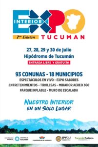 Este 27, 28, 29 y 30 de julio en el Hipódromo de Tucumán, se realizará la séptima edición de la «Expo Interior Tucuman», de la misma participan 98 comunas y 18 municipios, habrá espectáculos en vivo, Expo sabores, entretenimientos, tirolesas, mirador aéreo 360, entre otras atracciones. Dicho evento es organizado por el Ministerio del Interior y vicegobernador electo, CPN Miguel Acevedo.