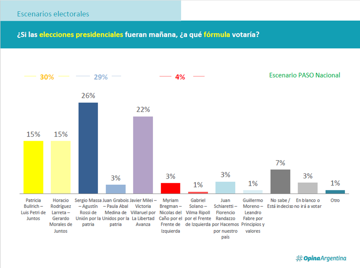 Una encuesta presencial que se conoció en las últimas horas es la de la consultora Opina Argentina, que muestra no sólo una paridad entre Juntos por el Cambio y Unión por la Patria en un escenario de PASO, sino un empate entre Patricia Bullrich y Horacio Rodríguez Larreta por la candidatura presidencial del principal espacio opositor.