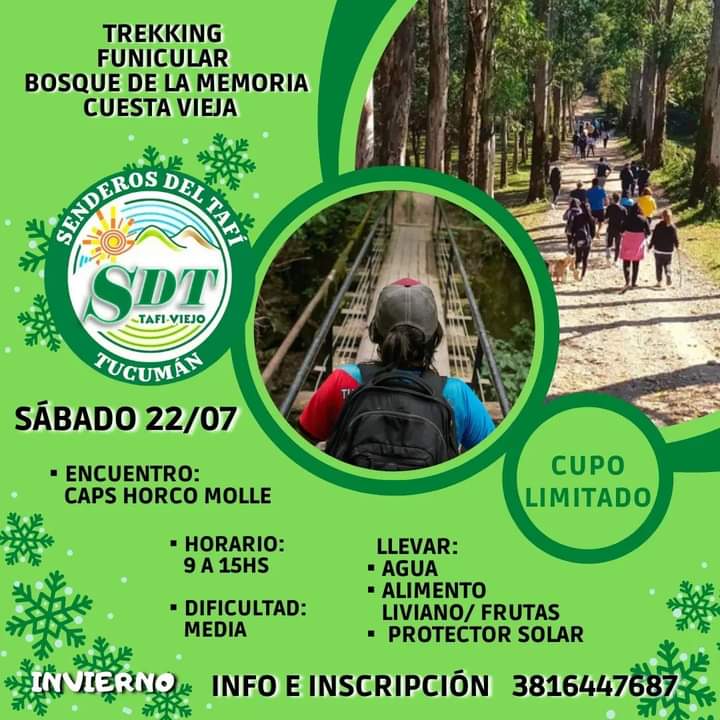 A partir de las 9 de la mañana del sábado 22 de julio, hasta las 15, Senderos de Tafí realizará la caminata que irá por Funiculares, Cuesta Vieja y el Bosque de la Memoria, El Caps de Horco Molle será el punto de encuentro para iniciar la actividad y los interesados puede comunicarse con Constanza al 3816447687 y en Instagram en el perfil de Senderos del Tafí.