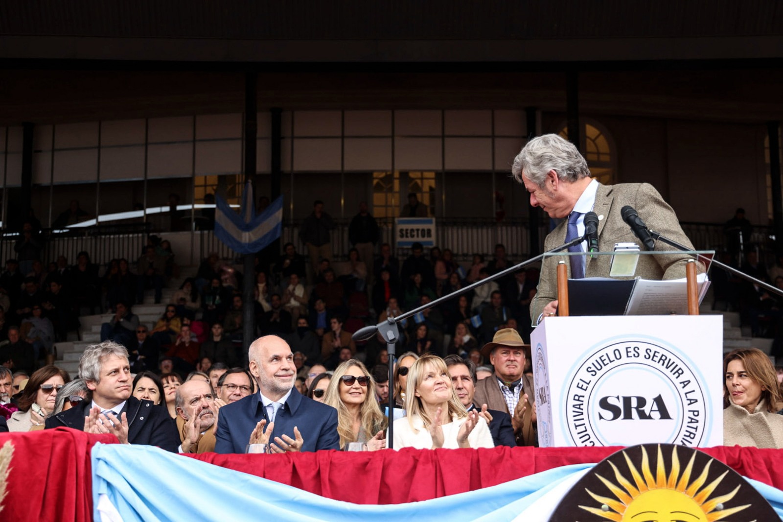 El discurso de apertura lo hizo el presidente de la Sociedad Rural Argentina (SRA), Nicolás Pino. Fue crítico con el Gobierno, se refirió a la situación actual del campo y, fundamentalmente, a la coyuntura general del país. En el final de sus palabras convocó al escenario a Rodríguez Larreta, quien lo acompañó y flameó una pequeña bandera argentina, en medio de los aplausos en las tribunas.