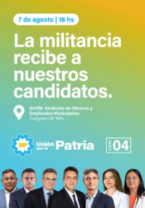 El sindicato de SOEM, a cargo de Cacho Acosta, recibirá este 7 de agosto a las 18 hs a los candidatos de Unión por la Patria, Lista 04, quienes encabezaran un acto dirigencial de cara a las PASO del próximo domingo.