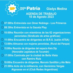 La precandidata a diputada nacional, Gladys Medina, mantuvo estos últimos días una agenda colapsa por reuniones con dirigentes, militantes y funcionarios haciendo hincapié en el apoyo a la fórmula de Massa – Rossi.