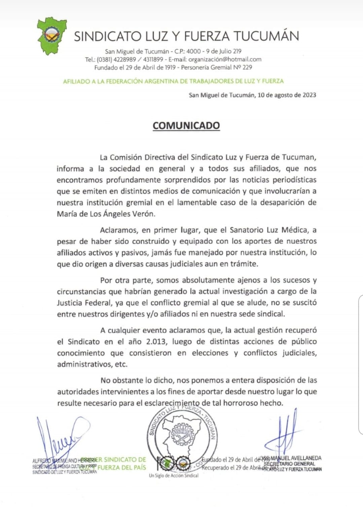 El secretario general de Luz y Fuerza Tucumán, José Avellaneda, rompió el silencio sobre el caso de la desaparición de María de los Ángeles Verón y la vinculación directa que le endilgó Susana Trimarco al gremio como cómplices de lo que le ocurrió a Marita. El nombre de Luz y Fuerza tomó estado público cuando la propia Trimarco tildó a la institución de «mafiosa» y habló de una carpeta con documentación de los últimos días de su hija internada en el sanatorio Luz Médica.