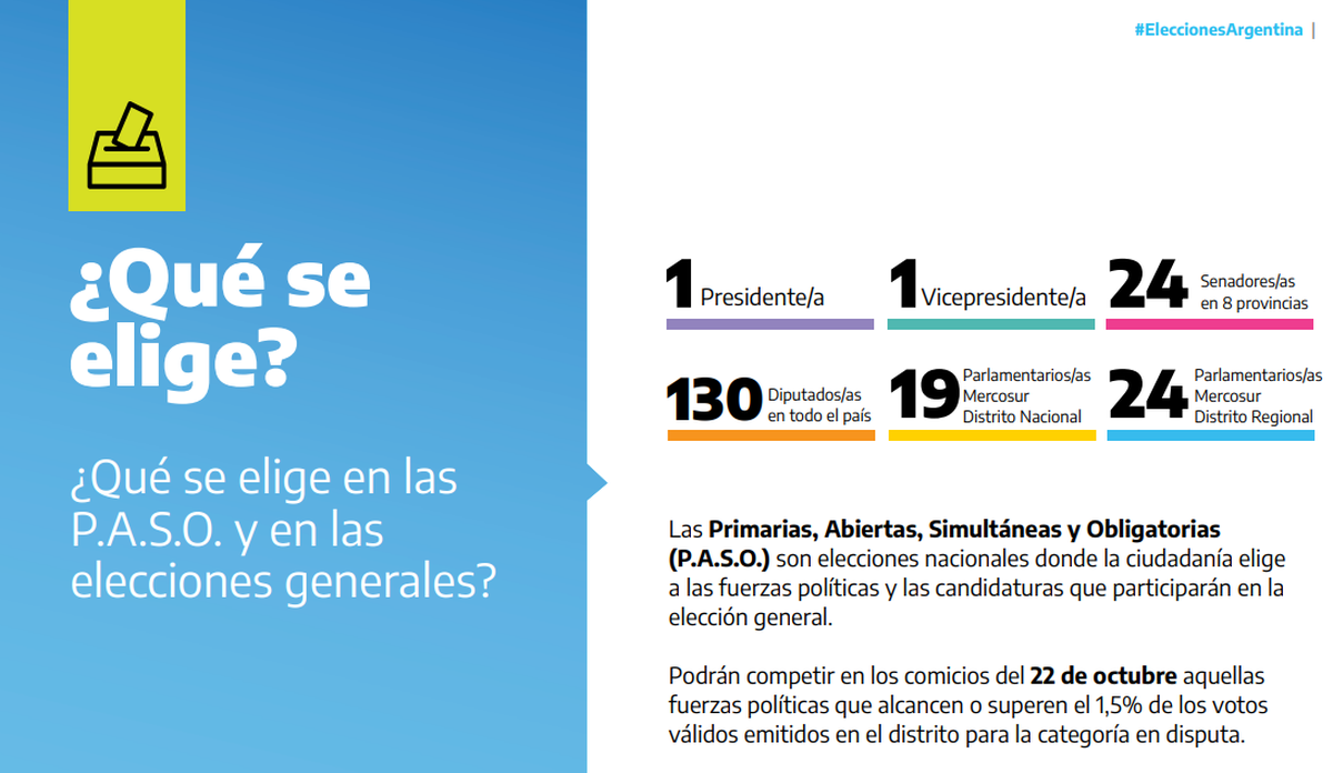Las Primarias, Abiertas, Simultáneas y Obligatorias (PASO), que se realizarán el próximo domingo 13 de agosto, son elecciones nacionales donde la ciudadanía define con su voto la oferta electoral que participará en las elecciones generales que se llevarán a cabo el 22 de octubre.