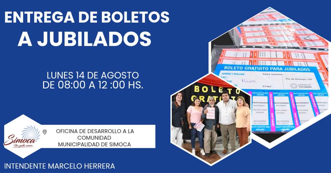 Este próximo lunes, la oficina de Desarrollo a la Comunidad de dicha ciudad, realizará la entrega del Boleto Gratuito a Jubilados, los interesados deben presentarse de 08:00 a 12:00 hs.