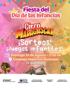 Este domingo 20 de agosto en el Complejo Deportivo Municipal, se realizaran shows infantiles, sorteos y juegos para agasajar a los más pequeños.