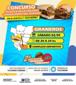 El municipio de Graneros invita a participar por un lugar en busca de la mejor sangucheria en la Fiesta Nacional del Sanguche de Milanesa, el mismo se llevará a cabo el dia de hoy en el Complejo Deportivo a partir de las 20:00 hasta las 24:00 hs. Es de destacar que también habrá un concurso del sanguchero más rápido.
