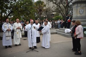 La misa, que fue encabezada por el arzobispo Carlos Sánchez. Los fieles se congregaron en la plaza Belgrano, que se encontraba bellamente decorada con flores y banderas en honor a la Virgen de la Merced y en conmemoración de la Batalla de Tucumán.