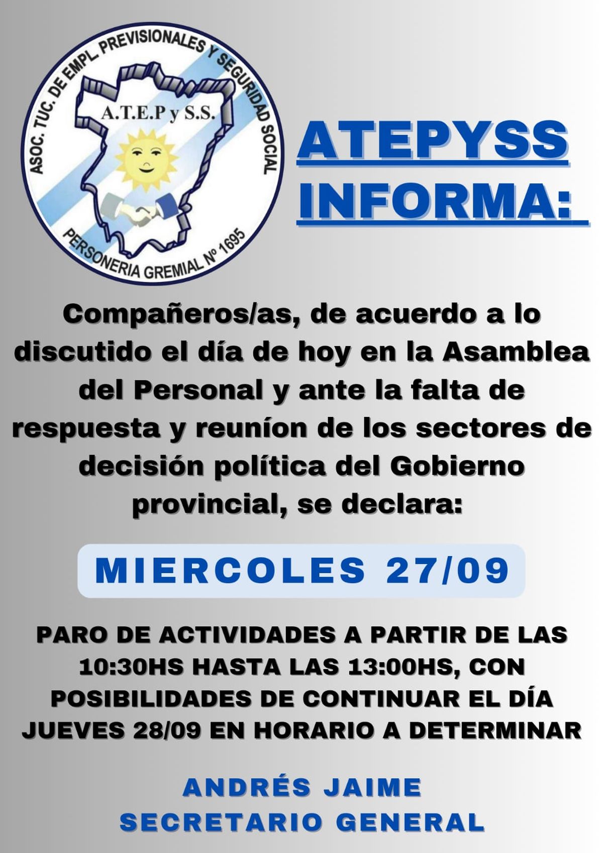 El gremio Atepyss, que representa a los trabajadores del Subsidio de Salud, ha anunciado un paro de actividades en respuesta a la falta de diálogo y respuesta por parte de los sectores de decisión política del gobierno provincial, según un comunicado difundido por el gremio.