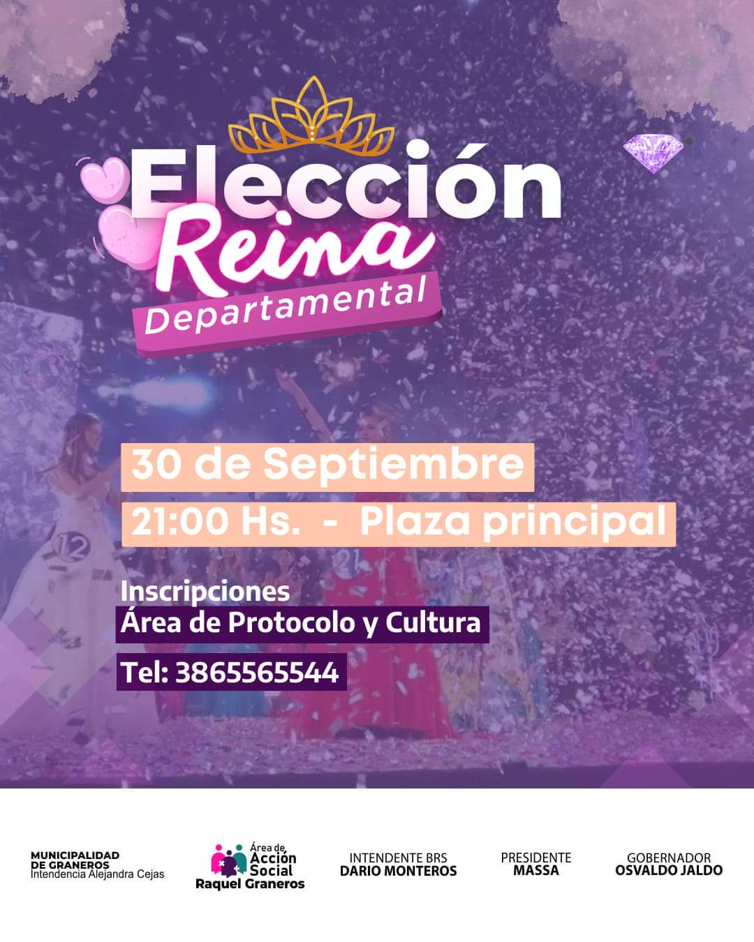 Este sábado 30 de septiembre en el municipio de Graneros se llevará a cabo la Elección de la Reina Departamental, todas las interesadas en participar deben comunicarse con el Área de Protocolo y Cultura.