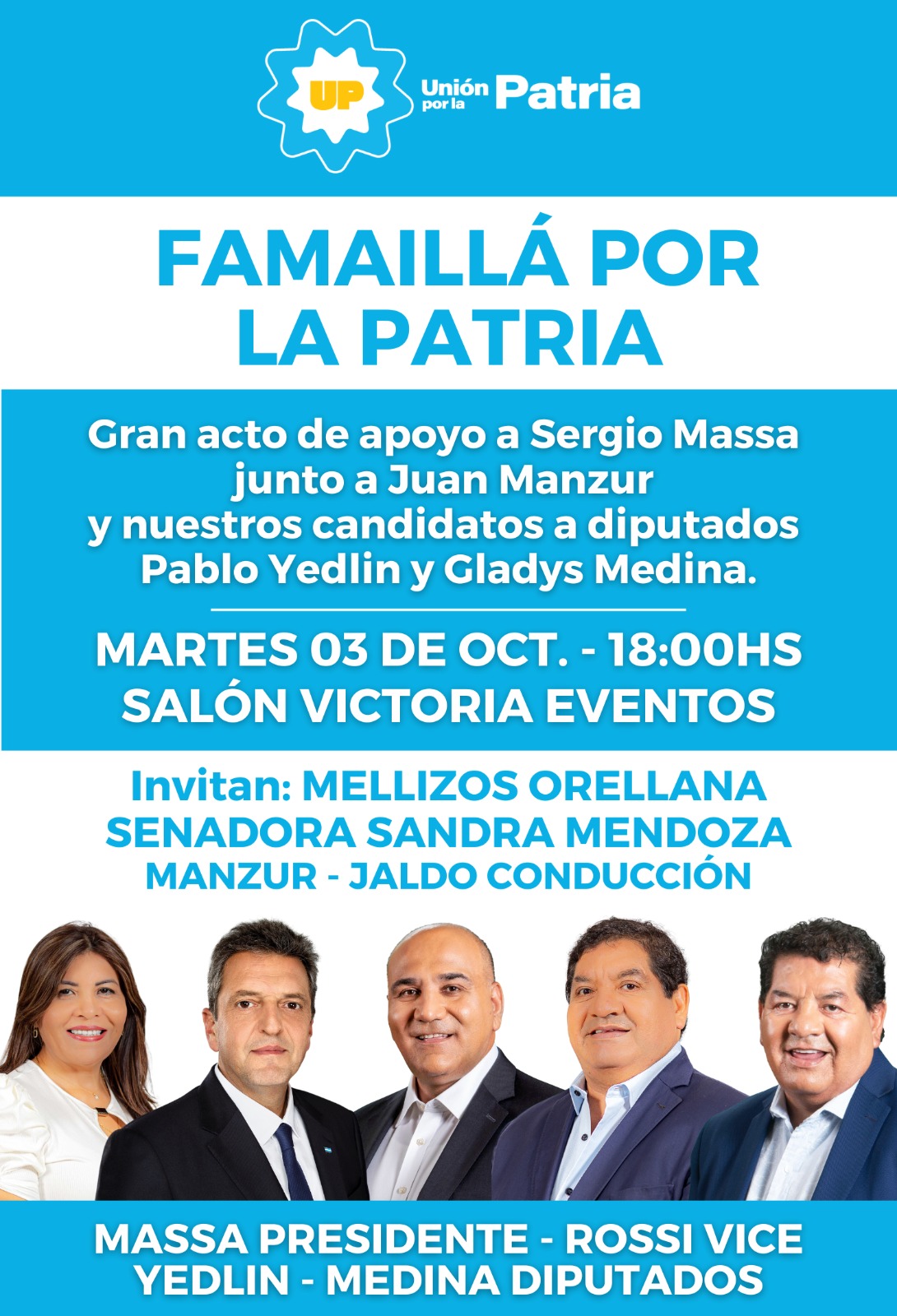 El mismo es realizado por los Mellizos Orellana y dará el apoyo a Sergio Massa Presidente, Agustín Rossi Vicepresidente y a los candidatos a diputados nacionales Pablo Yedlin y Gladys Medina.